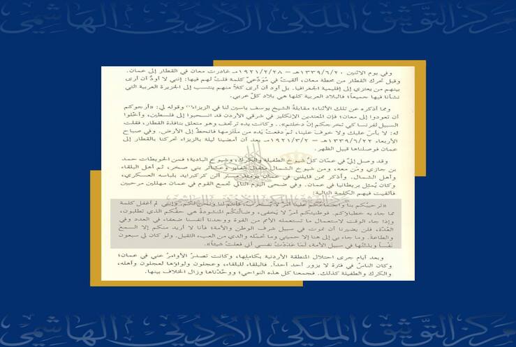 ينشر مركز التوثيق الملكي الأردني الهاشمي وثيقة بمناسبة ذكرى وصول الملك المؤسس الى عمّان ٢/٣/١٩٢١