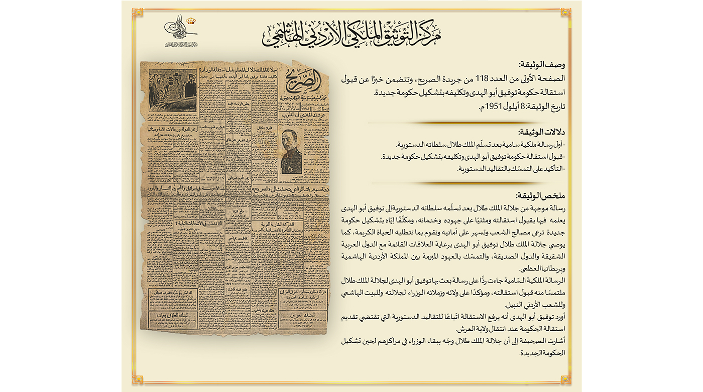 التوثيق الملكي ينشر وثيقة بمناسبة الذكرى 71 لتولي جلالة المغفور له الملك طلال سلطاته الدستورية