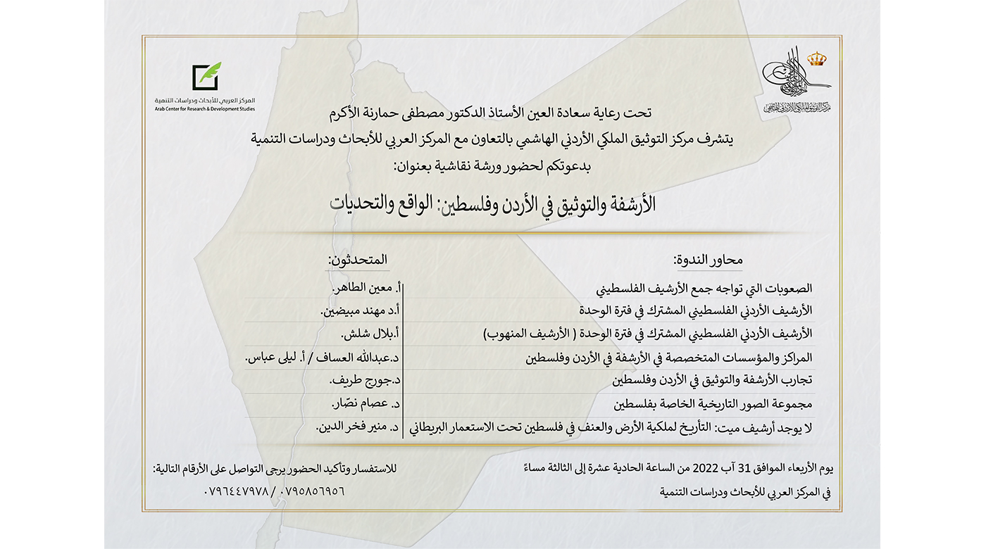 ورشة نقاشية بعنوان "الأرشفة والتوثيق في الأردن فلسطين: الواقع والتحديات"