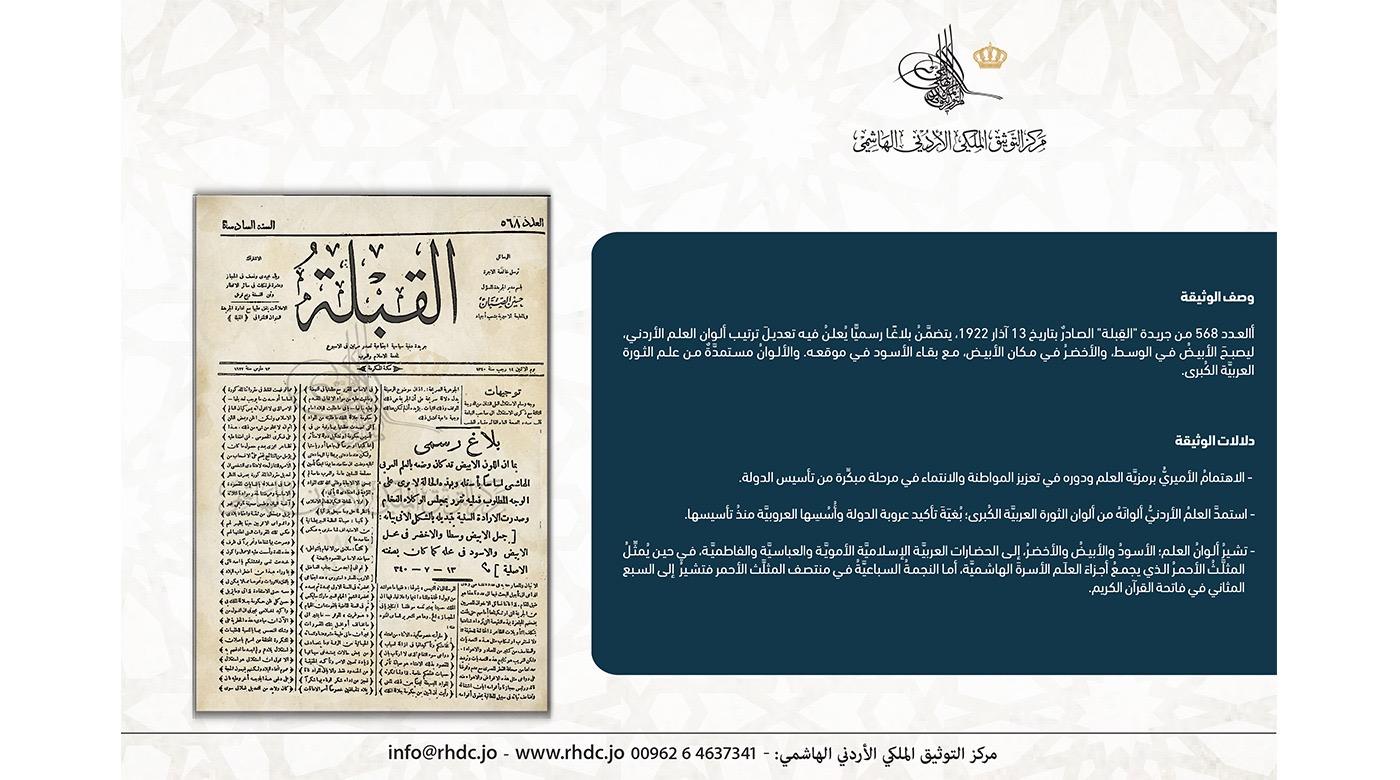 نشرَ مركزُ التوثيق الملكيُّ الأردنيُّ الهاشميُّ وثيقةً من أرشيفه تُظهِرُ العدد 568 من جريدة "القِبلة" الصادرة بتاريخ 13 آذار 1922، وَيَبرُزُ في هذا العدد البلاغُ الرسميُّ المتعلِّقُ بعلم الأردن، الذي يُوضِّحُ التعديلَ ...