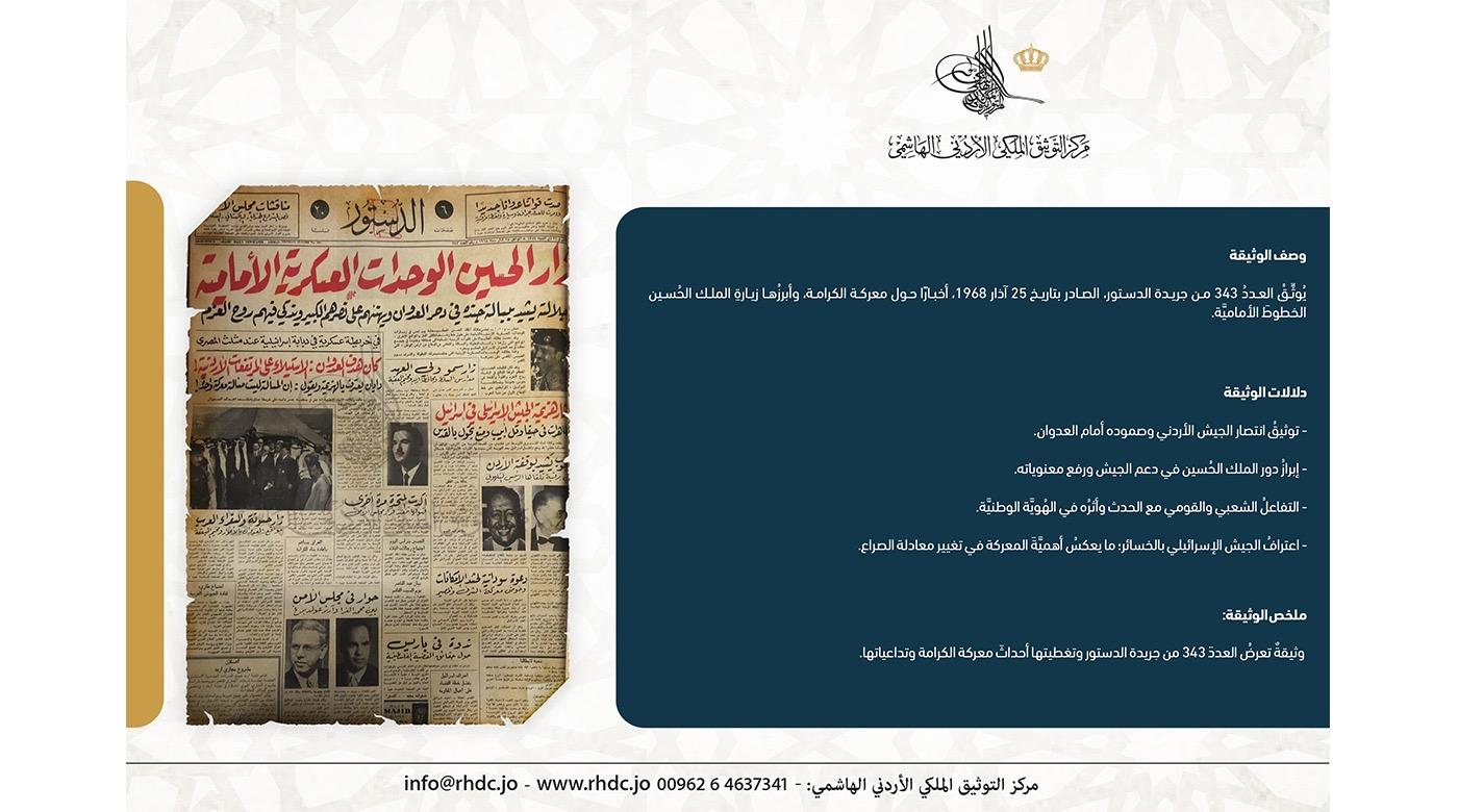 نشرَ مركزُ التوثيق الملكي الأردني الهاشمي وثيقةً تاريخها 25 آذار 1968، بالتزامن مع ذكرى معركة الكرامة، والتي حصلت بتاريخ ( 21-3-1968)جسَّد فيها الجيشُ العربي الأردني أروعَ البطولات والتضحيات في الدفاع عن الوطن. ...