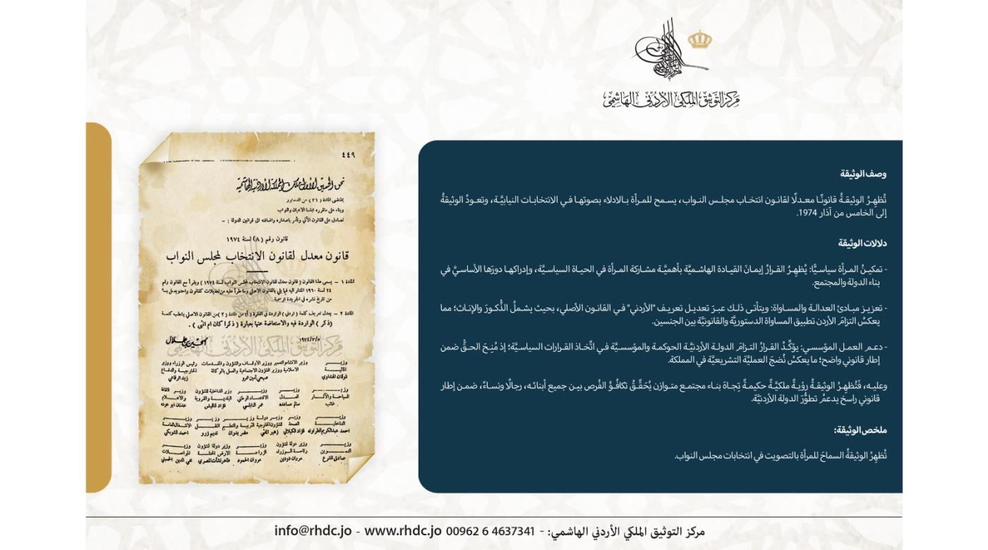 مركزُ التوثيق الملكي ينشرُ وثيقةً تُظهِرَ منحَ الملك الحُسين المرأةَ حقَّ الانتخاب في مجلس النواب