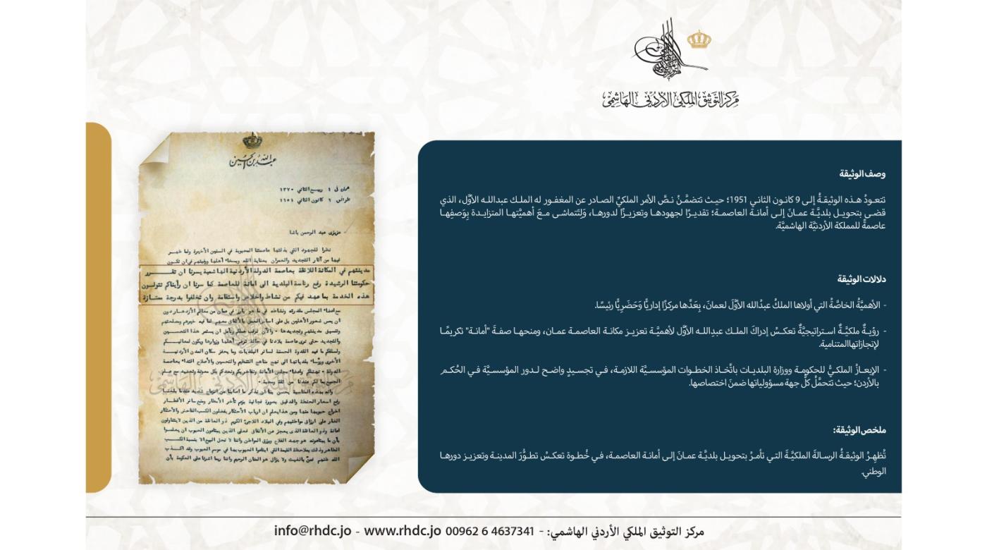 نشرَ مركزُ التوثيق الملكي الأردني الهاشمي وثيقةً تاريخيَّةً تُظهِرُ نصَّ الرسالة الملكيَّة التي أصدرها الملكُ عبدُالله الأوَّلُ ابنُ الحُسين بتاريخ التاسع من كانون الثاني ١٩٥١، التي قَضَت بتحويل بلديَّة عمانَ إلى أمانة ...