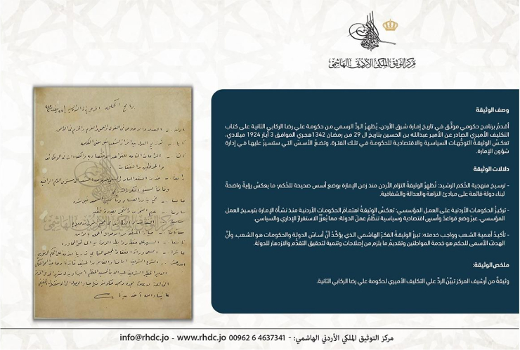 مركز التوثيق الملكي الأردني الهاشمي ينشر أقدم برنامج حكومي موثق في تاريخ الأردن