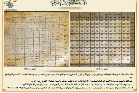 عرض مركز التوثيق الملكي الأردني الهاشمي، اليوم الثلاثاء، وثيقة توضح بيانات وأرقام عن أشجار ومحاصيل الزيتون، مفصلة حسب الأقضية والألوية عام 1953. وأوضح المركز في بيان، أن تقريرا صادرا عن دائرة الإحصاءات العامة، ضم بيانات وزارة الزراعة لكل من ألوية القدس ونابلس والخليل، إضافة إلى الألوية في شرق الأردن، ومقارنة مع جدول آخر، صدر عام 2019. واشار الى ان البيانات اظهرت ارتفاعا واضحا في عدد الأشجار وتحسنا كبيرا في نسبة إنتاج ثمار الزيتون في المناطق المذكورة. كما أظهرت الأرقام نموا في معدل إنتاج زيت الزيتون قياسا لكمية المحصول، حيث أن معدل إنتاج الشجرة الواحدة من ثمار الزيتون، تراوح بين 10 إلى 30 كيلو غراما عام 1953.
