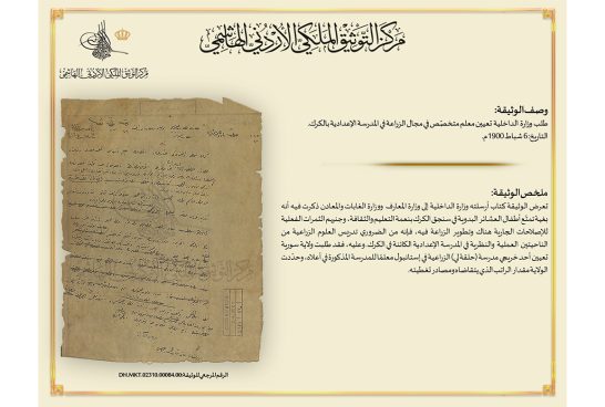يعرض مركز التوثيق الملكي وثيقة باللغة العثمانية وهي من محفوظات الأرشيف التركي والمنشورة في كتاب " الأردن من خلال وثائق الأرشيف العثماني" الصادر عن مركز التوثيق الملكي الأردني الهاشمي وبالتعاون مع مركز الأبحاث للتاريخ والفنون والثقافة الإسلامية (إرسيكا)، وهي عبارة عن كتاب أرسلته وزارة الداخلية في 6 شباط عام 1900م إلى وزارة المعارف ووزارة الغابات والمعادن ذكرت فيه أنه بغية تمتّع أطفال العشائر البدوية في سنجق الكرك بنعمة التعليم والثقافة، وجنيهم الثمرات الفعلية للإصلاحات الجارية هناك وتطوير الزراعة فيه، فإنه من الضروري تدريس العلوم الزراعية من الناحيتين العملية والنظرية في المدرسة الإعدادية الكائنة في الكرك. وعليه، فقد طلبت ولاية سورية تعيين أحد خريجي مدرسة (حلقة لي) الزراعية في إستانبول معلمًا للمدرسة المذكورة في أعلاه، وحدّدت الولاية مقدار الراتب الذي يتقاضاه ومصادر تغطيته.